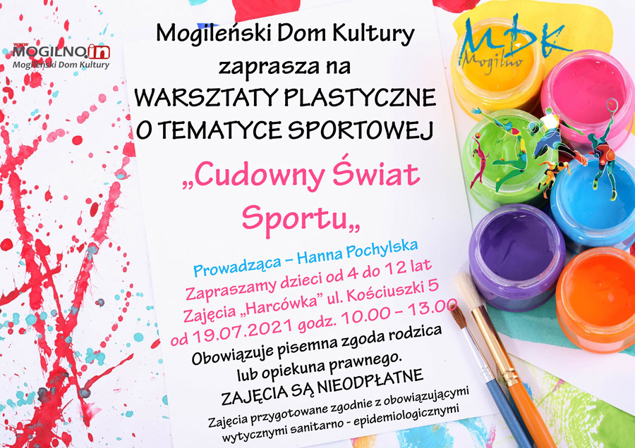 Mogileński Dom Kultury kolejny raz przeprowadza cieszące się dużą popularnością wśród najmłodszych mieszkańców Mogilna warsztaty plastyczne. W tym roku, w związku z trwającą olimpiadą w Japonii, nasi najmłodsi tworzyli prace pod wspólnym tytułem "Cudowny Świat Sportu". Były i "odlotowe buty" (sportowe oczywiście), tęczowe koszulki i prace związane z dyscyplinami sportowymi. Dzieci uczestniczyły także w zajęciach na świeżym powietrzu takich jak: rzut dyskiem, skok w dal, rzut oszczepem, biegi ze zniczem olimpijskim. Szczególnym zadaniem było wykonywanie flag olimpijskich. Zabawa połączona z edukacją oraz okolicznościowym poczęstunkiem była dla dzieci wielką atrakcją. Zajęcia prowadziła plastyk Hanna Pochylska, a zajęcia sportowe pomagał prowadzić instruktor MDK Arkadiusz "Rene" Renk.