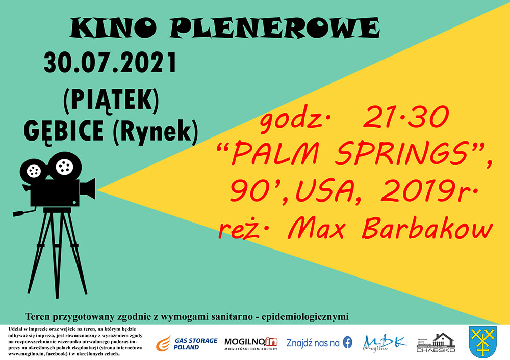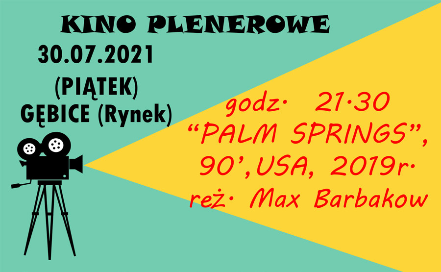 W dniu 30 lipca 2021 roku (piątek) na nowo zrewitalizowanym Rynku w Gębicach odbędzie się pokaz kina plenerowego. O godzinie 21:30 wyświetlona zostanie komedia "Palm Springs" produkcji USA.