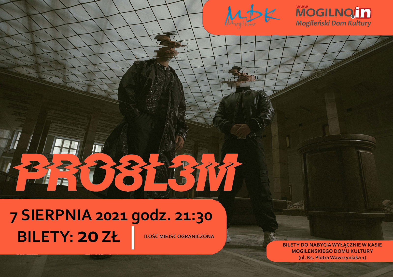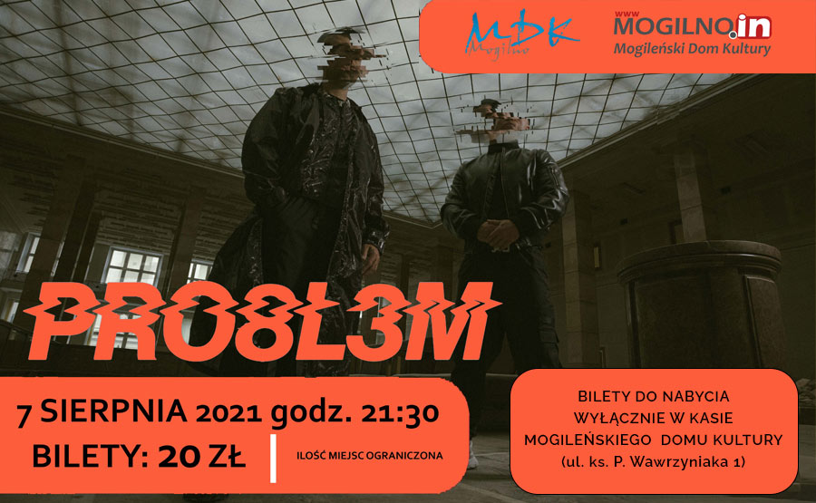 Mogileński Dom Kultury 7 sierpnia organizuje koncert hip-hopowy formacji PRO8L3M. Koncert odbędzie się w Amfiteatrze Letnim w Parku Miejskim w Mogilnie o godzinie 21:30. W związku z obowiązującymi przepisami sanitarno-epidemicznymi w wydarzeniu może wziąć udział 300 osób, w tym 150 zaszczepionych podwójną dawką, którzy zadeklarują, że są zaszczepieni. W celu sprawnego przeprowadzenia sprzedaży bilety nabywać będzie można wyłącznie w kasie Mogileńskiego Domu Kultury.