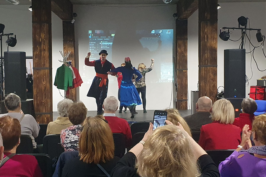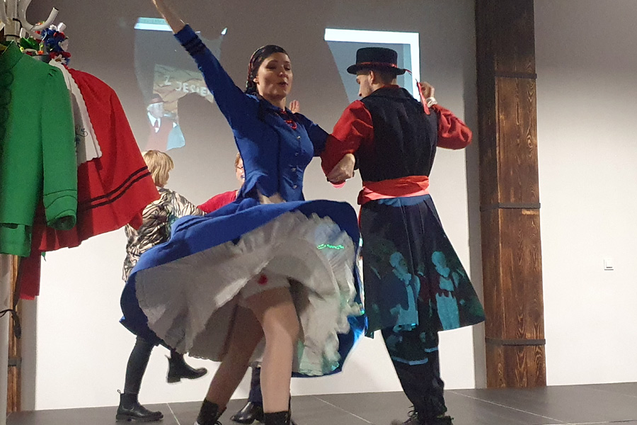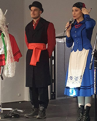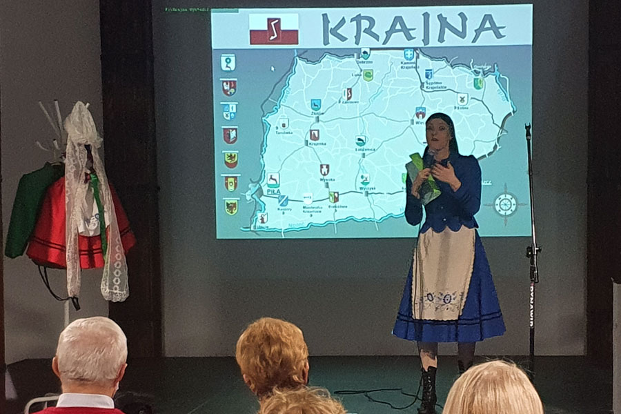 Głównym omawianym tematem była Krajna. Dowiedzieliśmy się o strojach, w których młodzi szli do ślubu, jak i również usłyszeć można było opowiadanie z czasów tych zwyczajów. Publiczność coraz większym zaciekawieniem spoglądała na scenę, aż w końcu wykładowczyni zaprosiła ich do wspólnego tańca. Zaprezentowane zostały trzy tańce krajeńskie, które mogły studentom przypomnieć im jak to kiedyś wyglądało i częściowo nakreślić klimat tamtych beztroskich i jakże innych czasów.